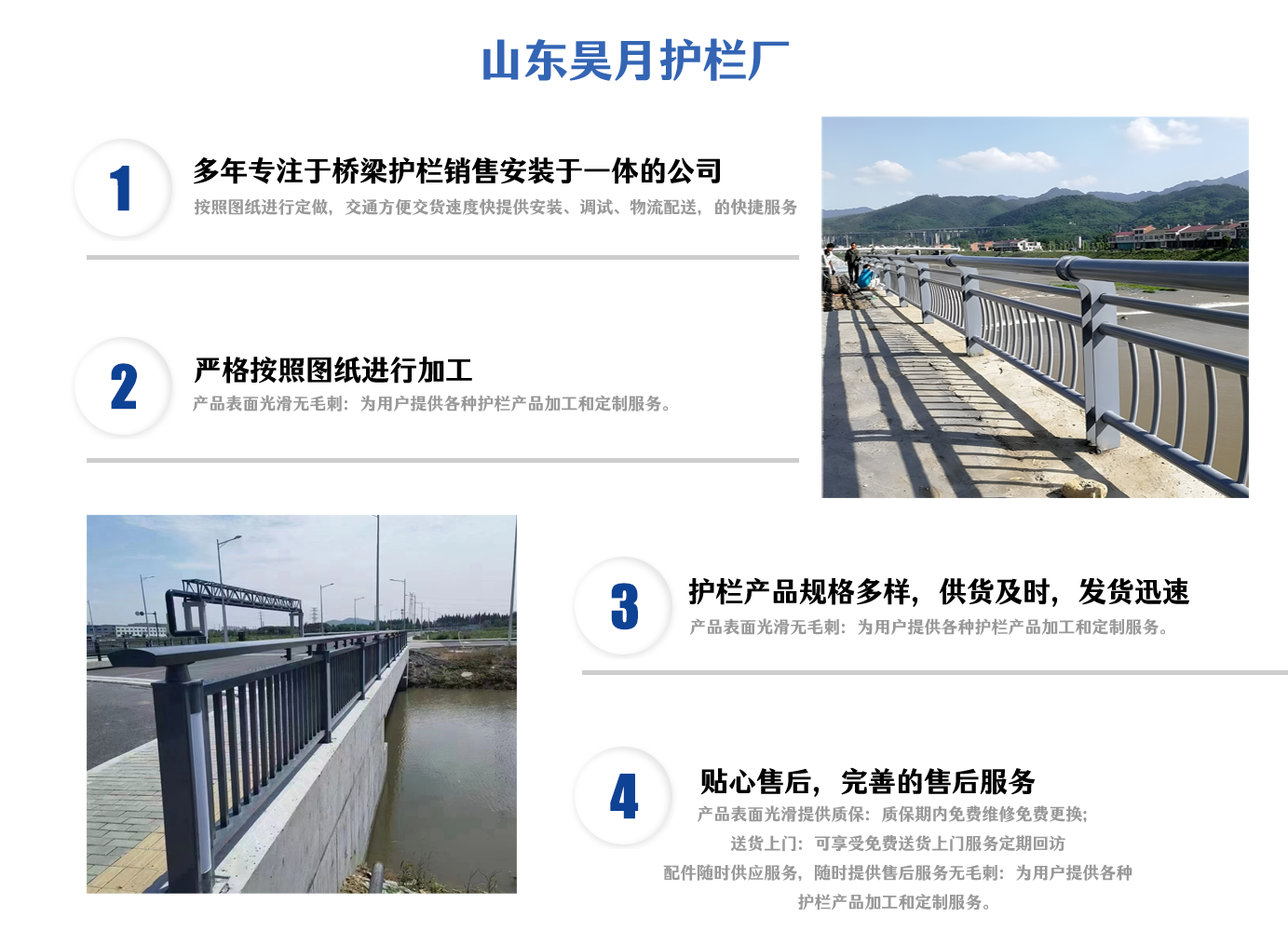 山東昊月金屬制品有限公司坐落于原材料豐富人文和諧交通發(fā)達及有“江北水城”之稱——聊城。 公司以科技興廠為宗旨,積極引進人才和技術(shù),不斷開拓創(chuàng)新. 主營產(chǎn)品:SS級橋梁防撞護欄,不銹鋼復(fù)合管護欄,鋁合金護欄,燈光護欄,河道護欄等等。產(chǎn)品本公司建立了一套科學(xué)的行之有效的質(zhì)量體系,擁有一支高技術(shù)、高素質(zhì)團隊,堅持以“誠信”為本,堅持“優(yōu)質(zhì)的質(zhì)量、貼心的服務(wù)”為崇高理念,為用戶提供質(zhì)優(yōu)價廉的產(chǎn)品提供至真至誠的服務(wù)。與客戶合作雙贏、攜手共創(chuàng)輝煌?! 」疽钥茖W(xué)的工藝、嚴格的質(zhì)量管理、完善的服務(wù)理念、合理的銷售價格贏得了良好的聲譽,建立了密切和愉快的合作關(guān)系。多年來,我們一直以良好的品質(zhì)、合理的價格,完善的質(zhì)量保障體系,完善的售后服務(wù)為客戶提供周到的服務(wù),滿足廣大客戶的需求?! ∥覀円孕抛u求生存,以質(zhì)量去競爭,以真誠換合作,以效益求發(fā)展,是我們的服務(wù)宗旨。我們積極主動與同行加強交流與時俱進,邁向新的歷程!我們竭誠歡迎您的咨詢和洽談,愿與同行業(yè)的同胞們合作共贏。...